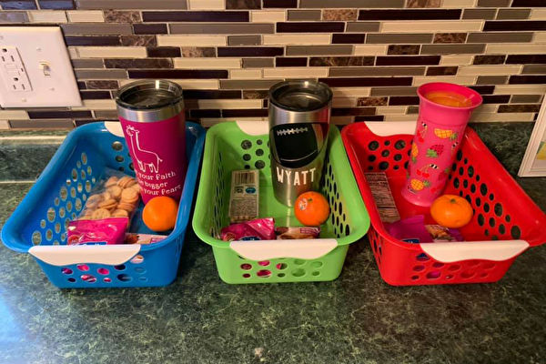 为减少孩子吃零食,霍尔斯特伦想出一个解决办法,实行每日‘零食配给’。具体做法是,她给每个孩子分配一个不同颜色的专属篮子,然后放在厨房里。每天早上她会把当天适量的零食和饮料放入篮子中。
