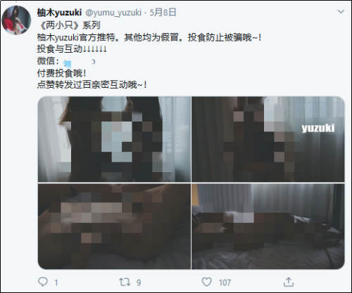 在推特搜索“柚木yuzuki”后发现,该账号长期发布各种女性大尺度的照片与视频。这些内容虽然没有露出女性正脸,但重要隐私部位一览无遗,并包含大量性暗示动作。