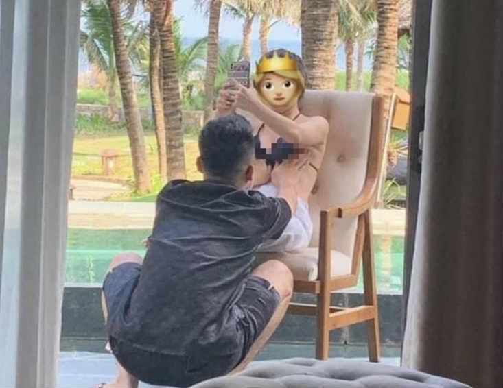 ▲身穿黑色比基尼的女孩正在自拍,男方用双手捧着女友的胸。